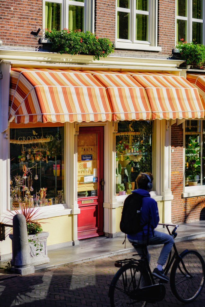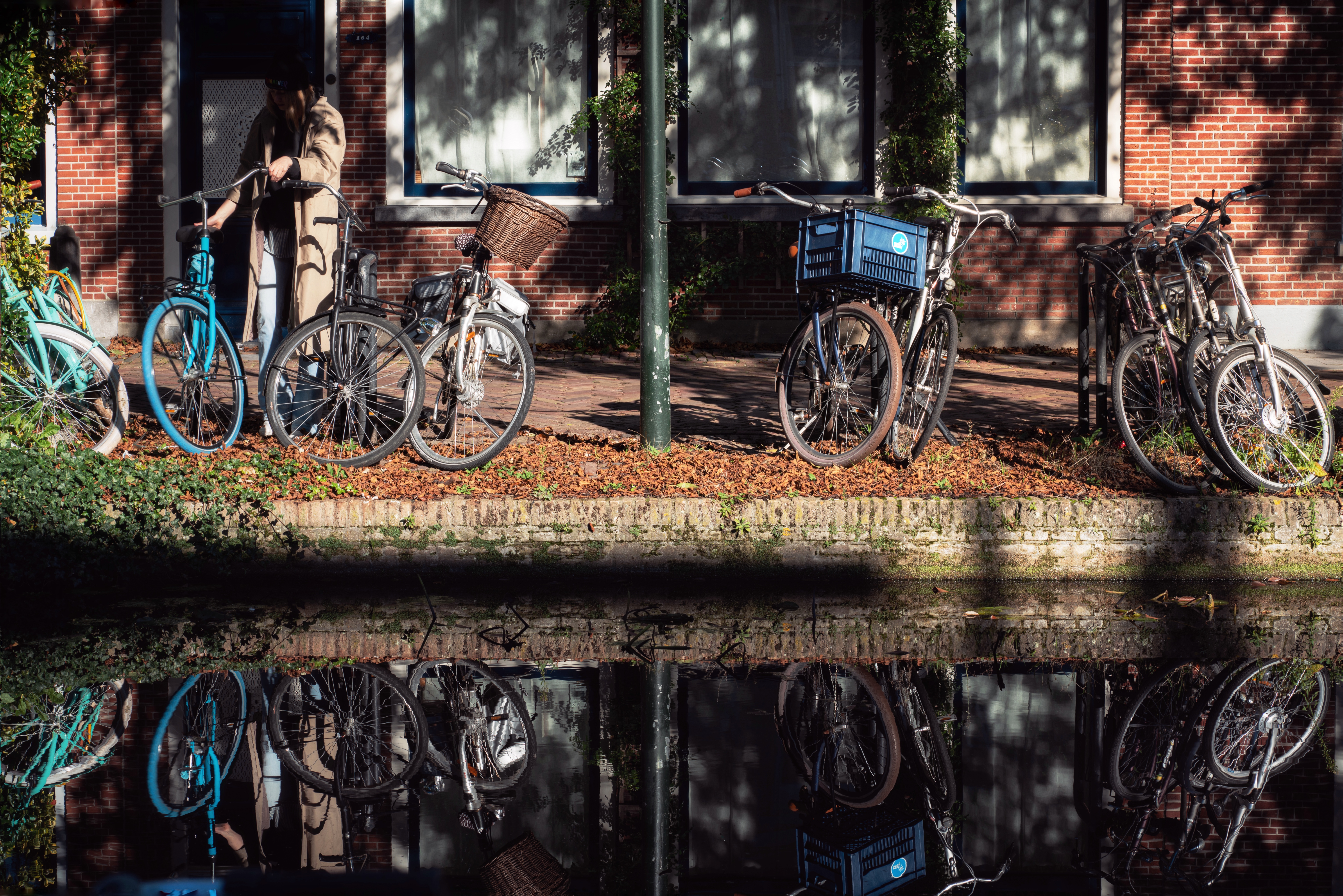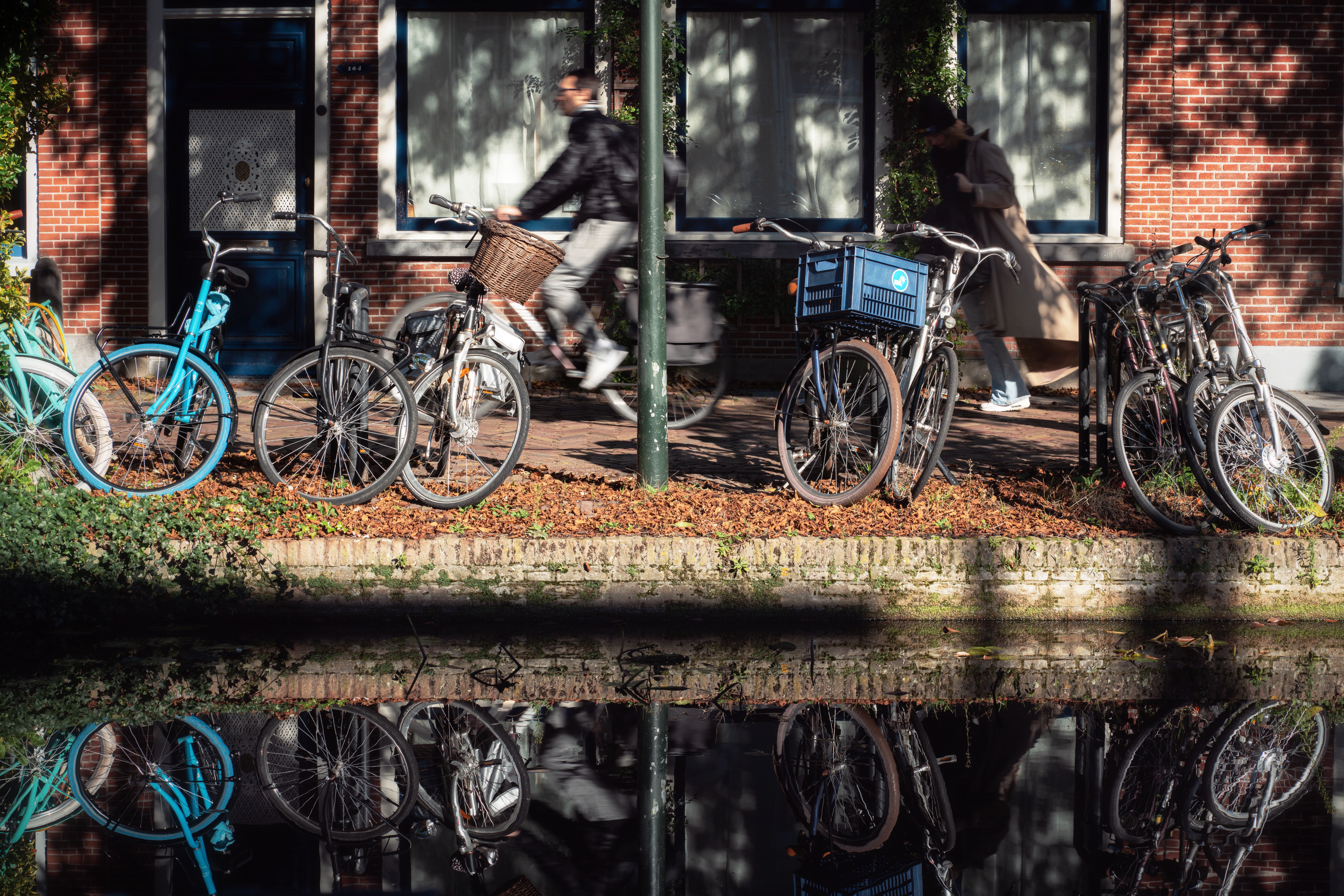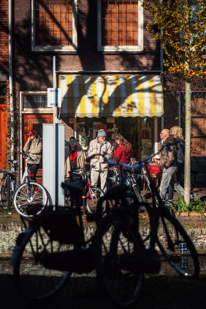 It was a bright, breezy day, which is not common in the Netherlands. Walking in the medieval city center on such a sunny day, you can find all the elements of street photography: light and shadows, color and contrast, geometry and silhouettes. So I was excited to capture some moments of cozy streets with my camera, hoping for some good shots. In the end, I was happy with some photos coming out of this lovely visit. And I knew I would have also liked this visit by simply enjoying the delicious octopus and banana mousse cake and by chatting with a good friend on a sunny afternoon like this. Besides, I’ve never tired of watching the reflections in the canals. When the canal is still and clear, the reflection of trees and buildings looks so real. As if there is a whole world in the water. When a gentle breeze ripples the surface of the canal, the reflection of yellow trees and the blue sky looks just like a vivid impressionist painting.